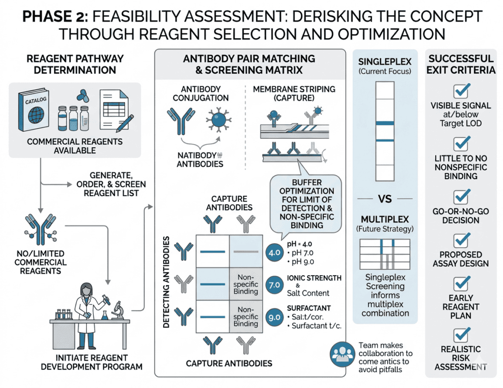 To exit feasibility successfully, a visible signal at or below the target limit of detection, with little to no nonspecific binding, should be apparent. A good feasibility assessment produces a clear go-or-no-go decision, a proposed assay design, an early reagent plan, and a realistic risk assessment.