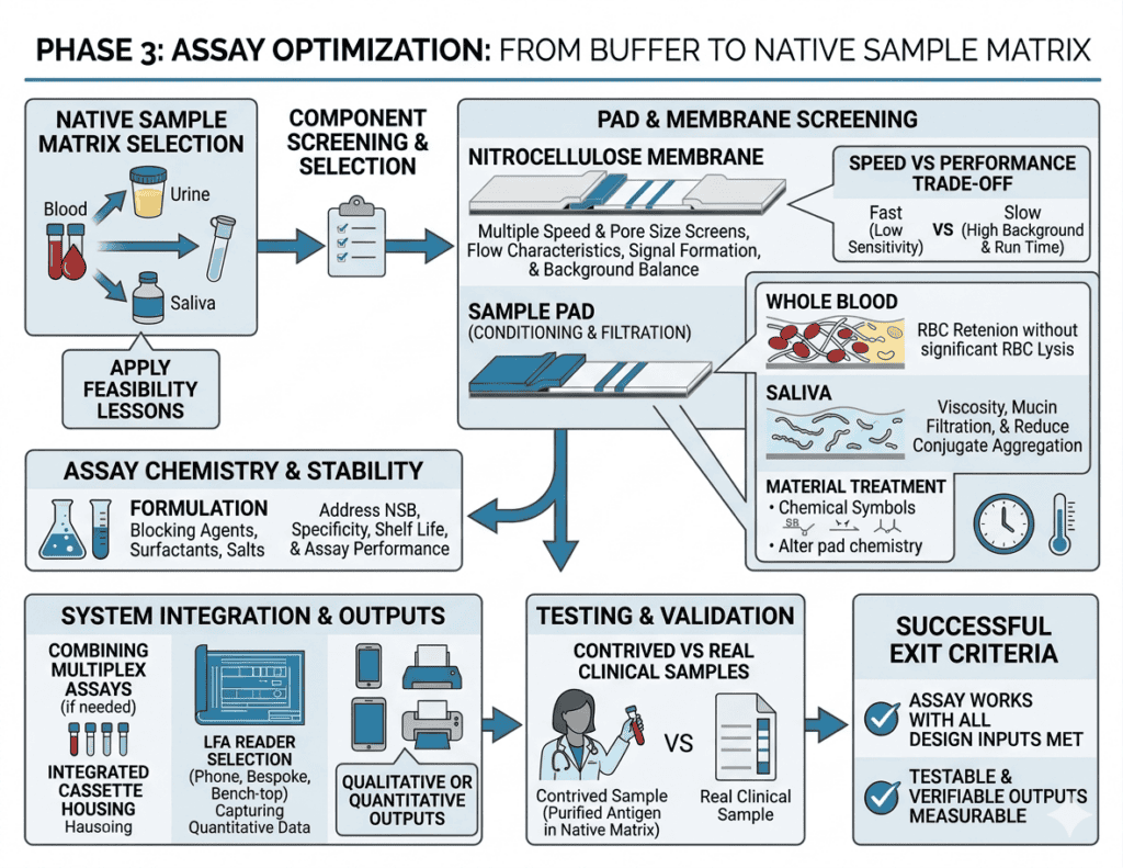 Whole blood, urine, saliva, and swab extracts do not behave the same way across care settings. This phase removes the risk that an assay works only in development and not in the environment where it will actually be used.