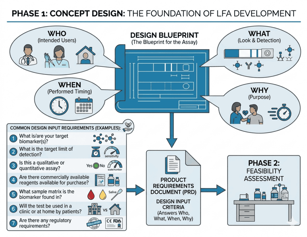 A Product Requirements Document is the standard output of this step. Common design input requirements for lateral flow assays include: